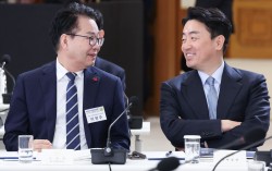 이한주 경제·인문사회연구회 이사장과 강훈식 비서실장과 지난달 9일 청와대에서 열린 경제성장전략 국민보고회에서 대화하고 있다. 뉴스1 국민의힘이 27일 인사혁신처 산하 정부공직자윤리위원회의 고위공직자 재산공개와 관련, 이재명 대통령 ‘멘토’로 불리는 이한주 정책특별…