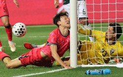 14일 대전월드컵경기장에서 열린 남자축구 국가대표 A매치 평가전 대한민국과 볼리비아의 경기. 이재성이 몸을 날려 헤더슛을 한 뒤 골대에 얼굴을 부딪치고 있다. 연합뉴스 한국축구가 볼리비아를 상대로 졸전 끝에 전반전을 0-0으로 마쳤다. 국제축구연맹(FIF…