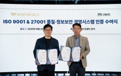 ICT 융합형 VFX 미디어 콘텐츠 그룹 ㈜웨스트월드(대표 손승현)가 업계 최초로 국제표준 정보보호경영시스템 ISO 27001과 품질경영시스템 ISO 9001 인증을 동시에 획득했다고 24일 밝혔다. 웨스트월드 손승현 대표와 한국품질재단 송지영 대표 (사진 제공=웨스트…