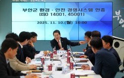 11월 10일 부안군 대회의실에서 진행된 ISO 14001(환경경영시스템) 및 ISO 45001(안전보건경영시스템) 인증 심사에서 권익현 군수(가운데)가 중소벤처기업인증원(KOSRE) 심사위원들과 경영자 면담을 통해 ESG 행정에 대한 리더십을 밝히고 있는 모습 …