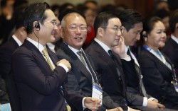 이재용 삼성전자 회장, 정의선 현대차그룹 회장, 구광모 LG그룹 회장, 정기선 HD현대 회장이 23일 오후 서울 중구 롯데호텔에서 열린 ‘한·브라질 비즈니스 포럼’에 참석했다. 뉴스1 루이스 이나시우 룰라 다 시우바 브라질 대통령이 23일 서울 소공동 롯…