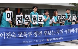 이진숙 사회부총리 겸 교육부 장관 후보자의 인사청문회가 하루 앞으로 다가온 가운데 전국교직원노동조합(전교조)이 자진 사퇴를 촉구하고 나섰다. 전국교직원노동조합 관계자들이 15일 서울 종로구 국정기획위원회 앞에서 기자회견을 열고 이진숙 교육부 장관 후보자의 자진 사퇴를 …