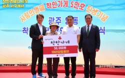 왼쪽부터 광주 김이강 서구청장, 1969양동통닭 장귀일 대표와 어머니, 광주 사랑의열매 구제길 회장 사랑의열매 사회복지공동모금회(회장 김병준) 전국 5만호 ‘착한가게’가 탄생했다. 2005년 ‘착한가게’를 출범한 이후 20년 만에 광주 양동시장 ‘1969…