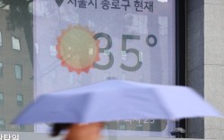 지난 9일 서울 종로구 한 건물 외벽에 현재기온 35도가 표시되고 있다. 뉴스1 폭염에 열사병·열탈진 등 온열 질환으로 응급실을 찾은 환자가 당국 집계 시작 이래 가장 빠른 속도로 1000명을 넘어섰다. 보건 당국은 야외 근로자와 노인 등 폭염 취약계층에…