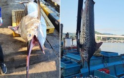 삼척 앞바다에서 잡힌 황새치. 연합뉴스 강원 삼척 앞바다에서 길이 3m, 무게 226㎏에 달하는 황새치가 잡혀 눈길을 끌고 있다. 삼척시의회 정연철 시의원은 10일 자신의 SNS에 삼척 정라진 앞바다에서 정치망 어선 S호에 잡힌 황새치를 사진을 올렸다. …