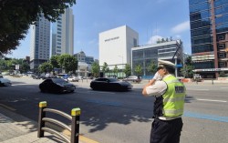 9일 오전 10시쯤 서울 강남구 청담동 경기고 사거리 동호대교 인근에서 서울 강남경찰서 한주현 경사(35)가 뙤약볕에서 땀을 훔치며 단속을 이어가고 있다. 오소영 기자 40.9도. 9일 오전 10시 서울 강남구 청담동 경기고 사거리 인근 불법 차량 단속을 위해 경…