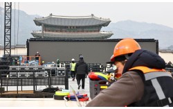 방탄소년단(BTS)의 서울 광화문광장 컴백 공연을 닷새 앞둔 16일 서울 종로구 광화문광장에서 관계자들이 무대 설치 작업을 하고 있다. 김종호 기자 오는 21일로 예정된 그룹 방탄소년단(BTS)의 복귀 공연이 나흘 앞으로 다가오며 인파 쏠림으로 인한 안전…