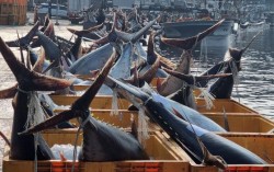 8일 경북 영덕군 강구항에서 어민들이 강구 앞 바다에서 잡힌 대형 참치들을 위판하기 위해 준비하고 있다. 참치들은 연안에서 약 20km 떨어진 곳에 쳐 둔 정치망 그물에 잡혔다. 뉴스1 경북 영덕에서 최근 아열대성 어종인 참치(참다랑어) 70마리가 한꺼…