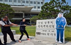 윤석열 전 대통령 친필 휘호 표지석을 훼손한 혐의로 민주노총 경남본부 소속 40대 A씨가 검찰에 송치되자 지역 노동계가 8일 경남 창원시 성산구 한국산업단지공단 경남지역본부 앞마당에 설치된 이 표지석을 밧줄로 묶고 잡아당기는 퍼포먼스를 하고 있다. 연합뉴스 …