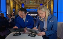 이원진 삼성전자 글로벌마케팅실장(왼쪽)과 커스티 코번트리 IOC 위원장이 '삼성 솔브포투모로우' 홍보대사들에게 전하는 응원 메세지를 태블릿에 작성하고 있다. 사진 삼성전자 삼성전자가 국제올림픽위원회(IOC)와 함께 글로벌 청소년 사회공헌(CSR) 프로그램…