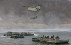 지난 14일 경기도 연천군 임진강에서 실시된 한미연합 도하훈련에서 미군 시누크 헬기가 부교를 공중 수송하고 있다. 한미연합훈련 '자유의 방패'(프리덤실드·FS) 연습 일환으로 실시된 이번 훈련에는 미2사단/한미연합사단과 한국군 수도기계화보병사단 및 7공병여단이 참가…