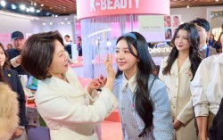 김혜경 여사가 지난 7일(현지시간) 중국 상하이 푸싱예술센터에서 열린 ‘상하이 K뷰티 글로우 위크(K-Beauty GLOW WEEK in Shanghai)’ 행사장에 방문해 인플루언서 차오루에게 화장을 해주고 있다. 청와대사진기자단 이재명 대통령과 중국을…
