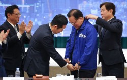 더불어민주당 정청래 대표가 8일 대구 북구 인터불고 엑스코 호텔에서 열린 더불어민주당 현장 최고위원회의에서 대구시장 후보인 김부겸 전 국무총리에게 당 점퍼를 입혀주고 있다. 연합뉴스 6·3 지방선거에서 대구 입성을 노리는 더불어민주당이 TK(대구·경북)…