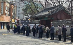 16일 오전 노인들이 서울 종로구 탑골공원 근처에서 무료급식을 받으러 줄 서서 기다리고 있다. 김남영 기자 16일 오전 11시 서울 종로구 탑골공원 담을 따라 노인 20여명이 줄지어 있다. 무료 급식을 기다린다. 기온이 11도이고 응달이라 으스스하게 추위…