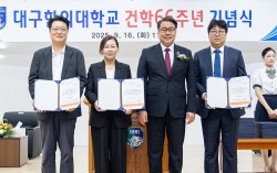 공로상을 수여하고 기념촬영하는 변창훈 총장과 수상자들 대구한의대학교(총장 변창훈)는 지난 16일 복지관 대강당에서 건학 66주년을 맞이해 기념식 행사를 개최했다. 이번행사는 ▲개식사, ▲국민의례, ▲연혁보고, ▲포상 및 장학증서 수여, ▲기념사, ▲…