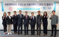 ▲세종대 엄종화(왼쪽에서 다섯 번째) 총장, 홍성경(왼쪽에서 네 번째) 대외부총장, 유네스코 국제기록유산센터 조윤명(오른쪽에서 네 번째) 사무총장을 비롯한 양측 관계자들이 기념촬영을 하고 있다. 세종대학교(총장 엄종화)는 지난 9월 9일 오후 3시, 집현…