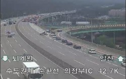18일 경기 의정부시 호원동 수도권제1순환고속도로 고양·일산 방면 호원IC 인근에서 승용차와 25t 화물트럭이 충돌, 화물트럭이 전도되면서 호원터널 입구를 가로막아 4개 차로 중 1개 차로만 통행이 가능해 차량 정체가 극심한 상황이다. 도시교통정보센터 제공 …
