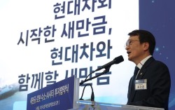 지난달 27일 전북 군산 새만금 컨벤션센터에서 열린 '새만금 로봇·수소·AI 시티 투자협약식'에서 당시 김의겸 새만금개발청장이 인사말을 하고 있다. 김 전 청장은 오는 6·3 군산·김제·부안갑 국회의원 재선거 출마를 위해 지난 13일 청장직을 내려놓았다. [청와대사진기…