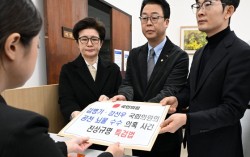 국민의힘 곽규택 원내수석대변인(오른쪽 둘째) 등이 7일 국회 의안과에 더불어민주당 김병기·강선우 국회의원의 공천 뇌물 수수 의혹 사건 진상규명 특검 법안을 제출하고 있다.