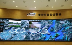 K-water(한국수자원공사) 물종합상황실에서 디지털 트윈 기술을 활용해 댐 시설 및 관련 하천 상황을 모니터링하고 있다. 가상 시뮬레이션 과정에서 대청댐 방류로 하천 수위가 상승하자 홍수 위험을 알리는 경보 시스템이 작동하고 있다. 사진 K-water …