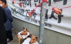 2023년 1월 18일 대구 북구 대현동 이슬람사원 공사현장에서 이슬람사원 건립을 반대하는 내용의 현수막이 걸려 있다. 그 아래로 일부 주민이 전시해둔 돼지머리와 족발이 보인다. 김정석 기자 지난 2년간 공사가 중단된 채로 방치됐던 대구 북구 대현동 이슬…