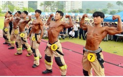 16일 충남 공주 중앙소방학교에서 열린 전국소방기술경연대회 ‘몸짱 소방관 경연’에 참가한 소방대원들이 근육을 뽐내고 있다.