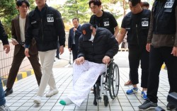 인천 한 공원에서 사실혼 관계인 50대 여성을 흉기로 살해하고 달아났다가 경찰특공대와 대치하던 중 검거된 50대 남성 A씨가 지난 5월 24일 구속 전 피의자 심문(영장실질심사)을 받기 위해 휠체어를 타고 인천 미추홀구 인천지방법원에 출석하고 있다. 연합뉴스 …