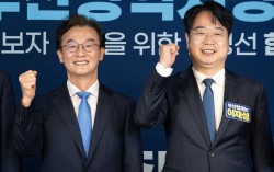전재수(왼쪽), 이재성 더불어민주당 부산광역시장 예비후보가 지난 6일 서울 여의도 중앙당사에서 열린 본경선 합동연설회에서 기념 촬영을 하고 있다. 뉴스1 더불어민주당이 9일 전재수(부산 북구갑) 의원을 6·3 지방선거 부산시장 후보로 확정했다. 소병훈 중앙당…