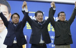 강기정 광주시장, 김영록 전남지사, 신정훈 민주당 의원(왼쪽부터)이 손을 맞잡고 있는 모습. 김영록 지사 페이스북 더불어민주당의 텃밭인 호남 경선판이 요동치고 있다. 6·3 지방선거에 출마할 광역단체장 본선 후보 자리를 두고 탈락 후보와 생존 후보들 간 막판 합종…