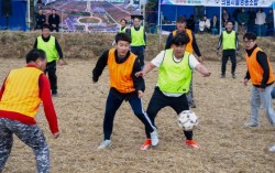 충북 제천시는 지난해 11월 제천 읍면동 10개 팀을 초청해 논두렁 축구대회를 개최했다. 사진 제천시 논두렁 축구·손야구 대회 개최 충북 제천에서 텅 빈 논을 운동장 삼아 공놀이를 하는 ‘논두렁 체육대회’가 열린다. 14일 제천시에 따르면 제천 농민단…