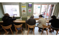 지난 10일 점심시간 무렵 부산 동구 수정동의 공공 라면카페 '끼리라면'에서 주민들이 라면을 먹으며 이야기를 나누고 있다. 송봉근 객원기자 “라면 한그릇 끼리(끓여) 무러 왔습니더.” 지난 10일 오전 11시20분쯤 부산 동구 수정동 공공 라면카페 ‘끼리…