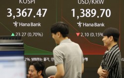 12일 서울 중구 하나은행 본점 딜링룸에서 직원들이 업무를 보고 있다. 이날 코스피는 전장보다 30.45포인트(0.91%) 오른 3374.65로, 원/달러 환율 1.8원 내린 1,390.0원으로 시작했다. 연합뉴스 코스피가 12일 오전 장중 연이어 최고 기록을 갈…