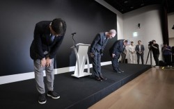 김영섭 KT 사장(가운데)이 11일 서울 종로구 KT 광화문빌딩 웨스트 사옥에서 소액결제 피해와 관련해 고개 숙여 사과하고 있다. 연합뉴스 KT는 11일 무단 소액결제 사태의 원인으로 주목되는 불법 초소형 기지국을 통해 이용자 5561명의 개인정보 유출 가능성을 …