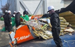 12일 국토교통부와 항공철도사고조사위원회, 전남과학청 과학수사대 관계자들이 무안국제공항 공항소방대 뒤편에 보관된 여객기 잔해를 조사하고 있다. 사진 무안공항 제주항공 여객기 참사 유가족협의회 12·29 제주항공 여객기 참사 잔해를 재조사하는 과정에서 희생…