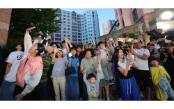 제21대 대통령 선거일인 3일 오후 더불어민주당 이재명 후보의 자택인 인천 계양구 아파트에서 주민들이 핸드폰으로 방송사 출구조사 결과를 보며 환호하고 있다. 연합뉴스 제21대 대통령선거 출구 조사와 개표 과정에서 이재명 더불어민주당 후보의 당선이 확실시되…