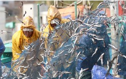 12일 부산 기장군 대변항에서 작업자들이 갓 잡아 올린 봄 멸치를 그물에서 털어내고 있다. 내일(13일)은 중부지방이 대체로 맑다가 오후부터 차차 흐려지겠으며 남부지방과 제주도는 구름이 많겠다. 부산·울산은 오전까지 비가 이어지겠고 강원 동해안·산지와 경북 동해안·북동…
