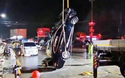 지난 2일 오후 전남 진도군 임회면 진도항 인근에서 일가족 3명이 탑승한 차량에 해상으로 인양되고 있다. 사진 목포해양경찰서 전남 진도 해상에 차량을 돌진시켜 일가족 3명을 숨지게 한 40대 가장은 거액의 채무와 생활고 때문에 범행을 저지른 것으로 드러났…
