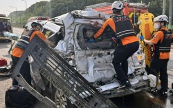 29일 오전 인천공항고속도로 서울 방향 인천공항톨게이트(TG) 인근에서 25t 덤프트럭이 도로 위에 멈춰 있던 카니발 차량 뒷부분을 추돌했다. 사진 인천소방본부 인천국제공항고속도로에서 대형 덤프트럭이 고장으로 멈춘 승합차를 들이받아 1명이 숨졌다. 29일 오…