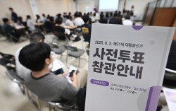 제21대 대통령선거 사전투표(5월 29일~30일) 시작을 사흘 앞둔 지난 26일 오후 서울 중랑구 선거관리위원회에서 사전투표 관리관들이 공정선거참관단의 참관 아래 교육을 받고 있다. 뉴스1 6·3 대통령선거를 앞두고 안전사고를 예방하기 위해 28일부터 민…