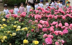 26일 부산 북구 화명동 장미원을 찾은 어린이와 시민들이 활짝 핀 장미를 보며 나들이를 즐기고 있다. 이 장미원에는 1만8950㎡ 부지에 49종의 장미 1만2860주가 심겨 있다.