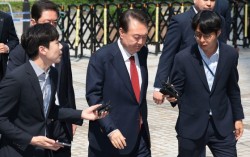 윤석열 전 대통령이 26일 서울 서초구 서울중앙지방법원에서 열린 내란 우두머리 혐의ㆍ직권남용 권리행사 방해 혐의 사건 5차 공판에 출석하고 있다. 뉴스1 내란 혐의로 재판에 넘겨진 윤석열 전 대통령이 26일 5차 공판을 위해 법원에 출석하면서 이번에도 묵묵부답이었…