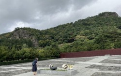 한 시민이 경남 김해시 진영읍 봉하마을 고(故) 노무현 전 대통령 묘역에서 참배하고 있다. 왼쪽 뒤에 보이는 바위가 노 전 대통령이 투신한 부엉이바위다. 고대훈 기자 「 3화 : 노무현의 죽음을 둘러싼 의문들 」 “트라우마가 심해서 그 일에 대해선 일절 답하지…
