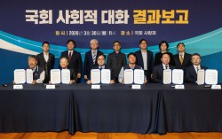 30일 국회 사랑재에서 국회 사회적 대화 결과보고회가 열렸다.왼쪽부터 김동명 한국노총 위원장, 손경식 한국경영자총협회 회장, 우원식 국회의장, 양경수 민주노총 위원장, 최태원 대한상공회의소 회장, 오기웅 중소기업중앙회 부회장. 뉴스1 국회와 노동계, 경영계가 인공…