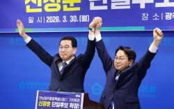 신정훈 후보가 30일 광주시의회에서 더불어민주당 전남광주통합특별시장 강기정 후보와 단일후보로 확정된후 두손을 들어올리고 있다. 뉴스1 더불어민주당 전남광주통합특별시장 경선의 판세가 요동치고 있다. 신정훈 후보가 강기정 후보와의 단일화 여론조사에서 승리하며…