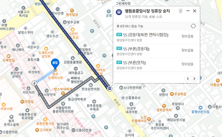 2시간 4분전중앙시장 정류장에서 55번 55-1번 버스 탑승하시 33개 정류장 후