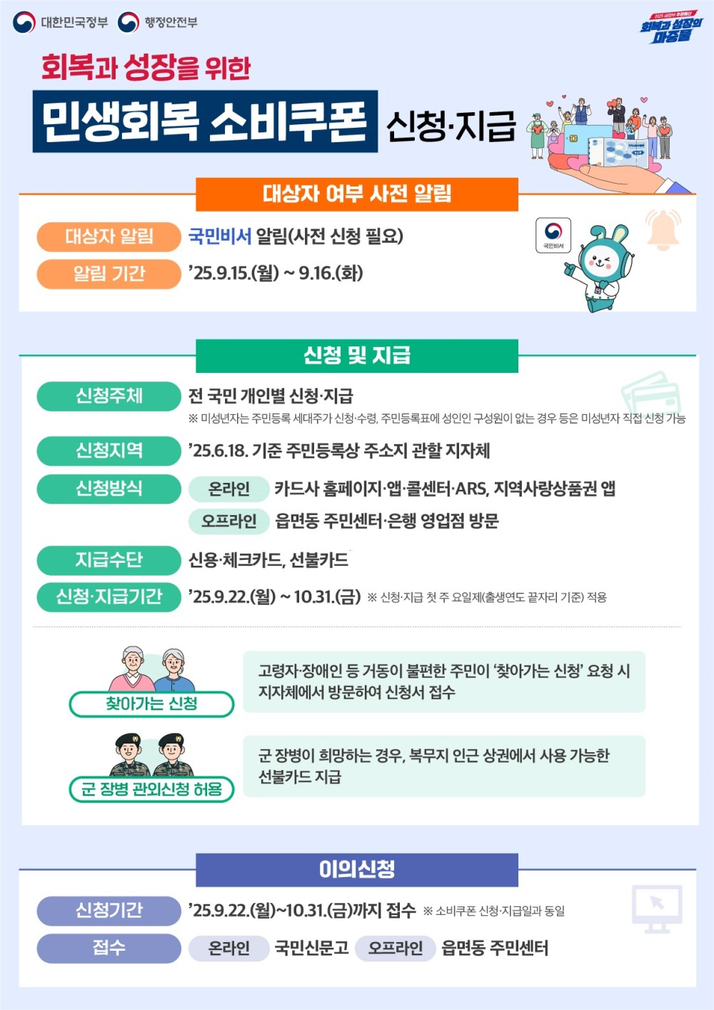 민생경제 회복을 위한 특단의 조치로 관내 소비를 활성화하고 소상공인 및 자영업자의 매출을 확대하기 위해 추진하는「민생회복 소비쿠폰 2차 지원」과 관련하여 신청일시, 장소 등을 아래와 같이 안내드리오니 군민 여러분의 많은 관심 바랍니다.
