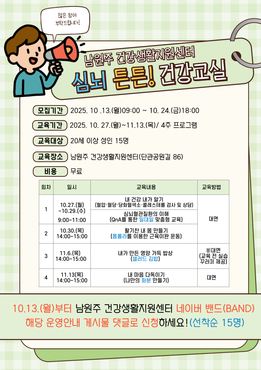 [원주시] 남원주건강생활지원센터 하반기 심뇌튼튼 건강교실 프로그램 참여자 모집 안내
