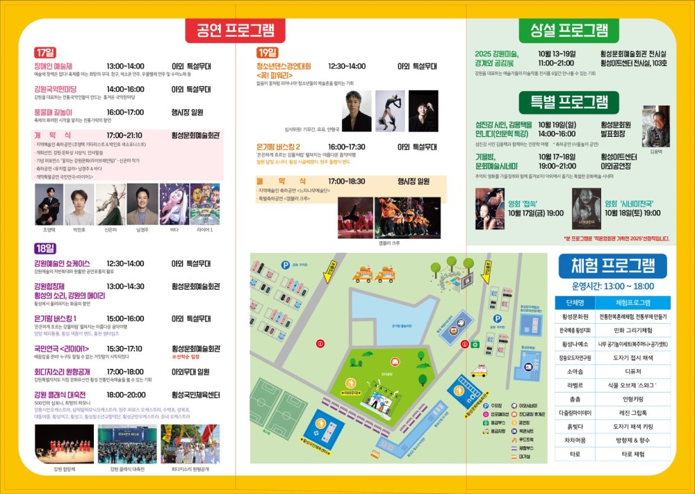 ○ 주관: 횡성군, 한국예총 횡성지회, 횡성문화관광재단, 횡성문화원행사 프로그램 및 일정은 리플릿을 참고해주시기 바라며, 많은 관심 부탁드립니다.