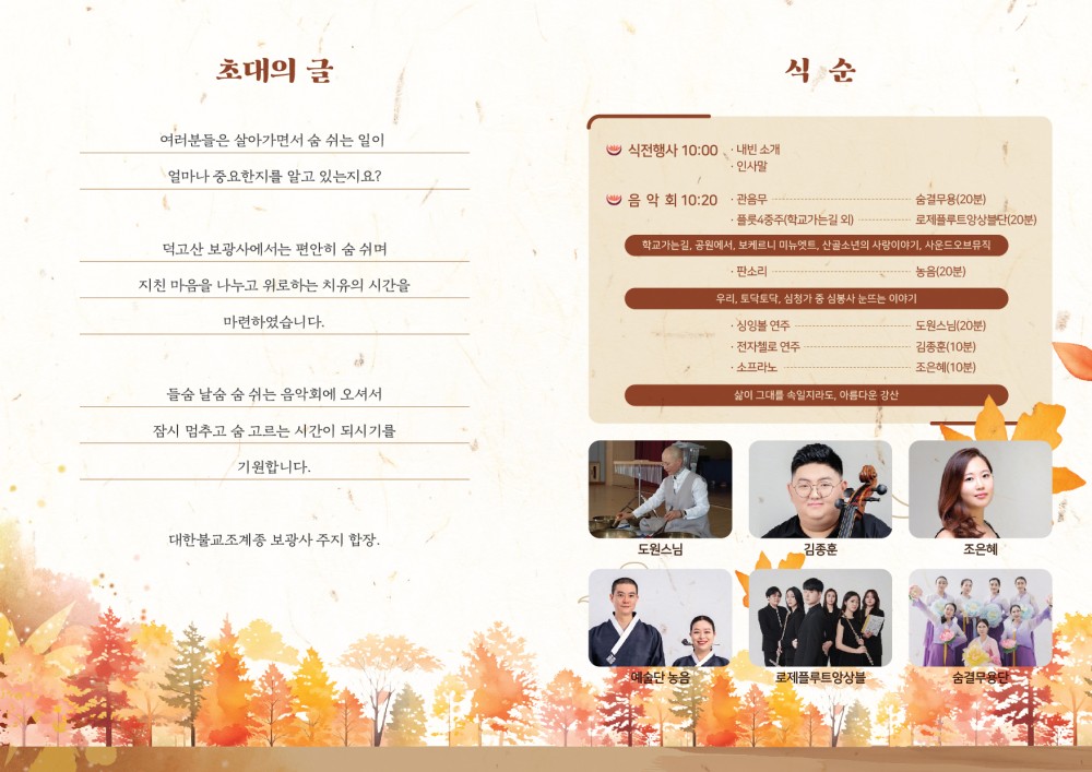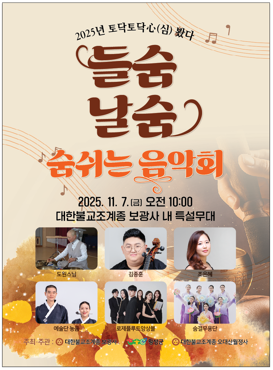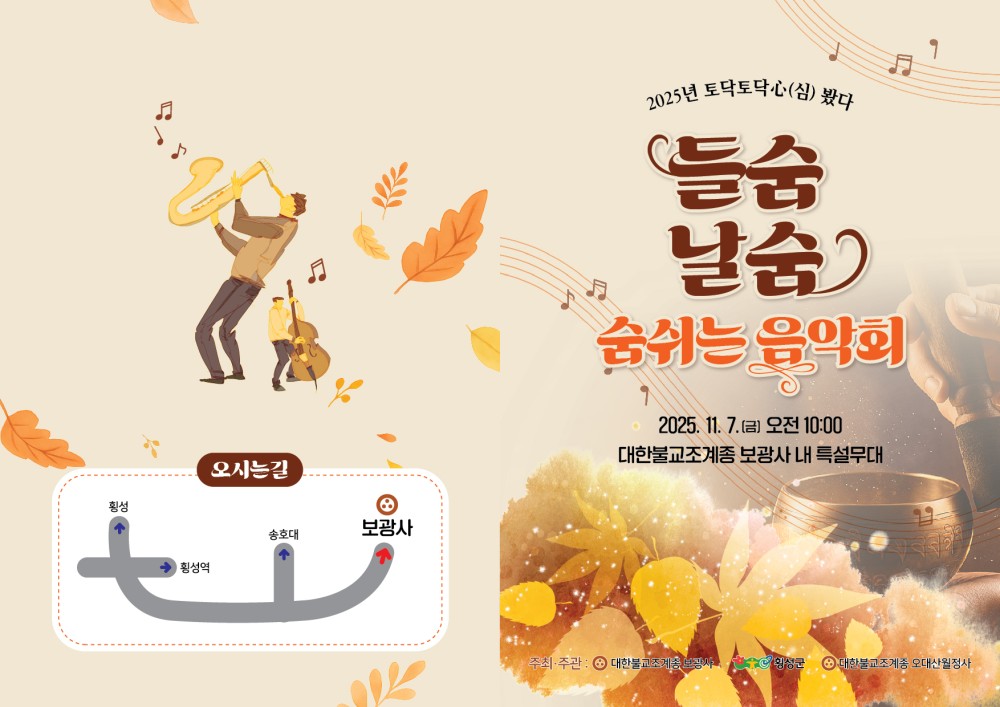 역사의 숨결이 깃든 공간에서 자연과 음악이 하나 되는 특별한 행사에 여러분의 따뜻한 관심과 참여를 부탁 드립니다.○ 행 사 명: 2025년 토닥토닥 心(심)봤다 '들숨날숨 숨쉬는 음악회'