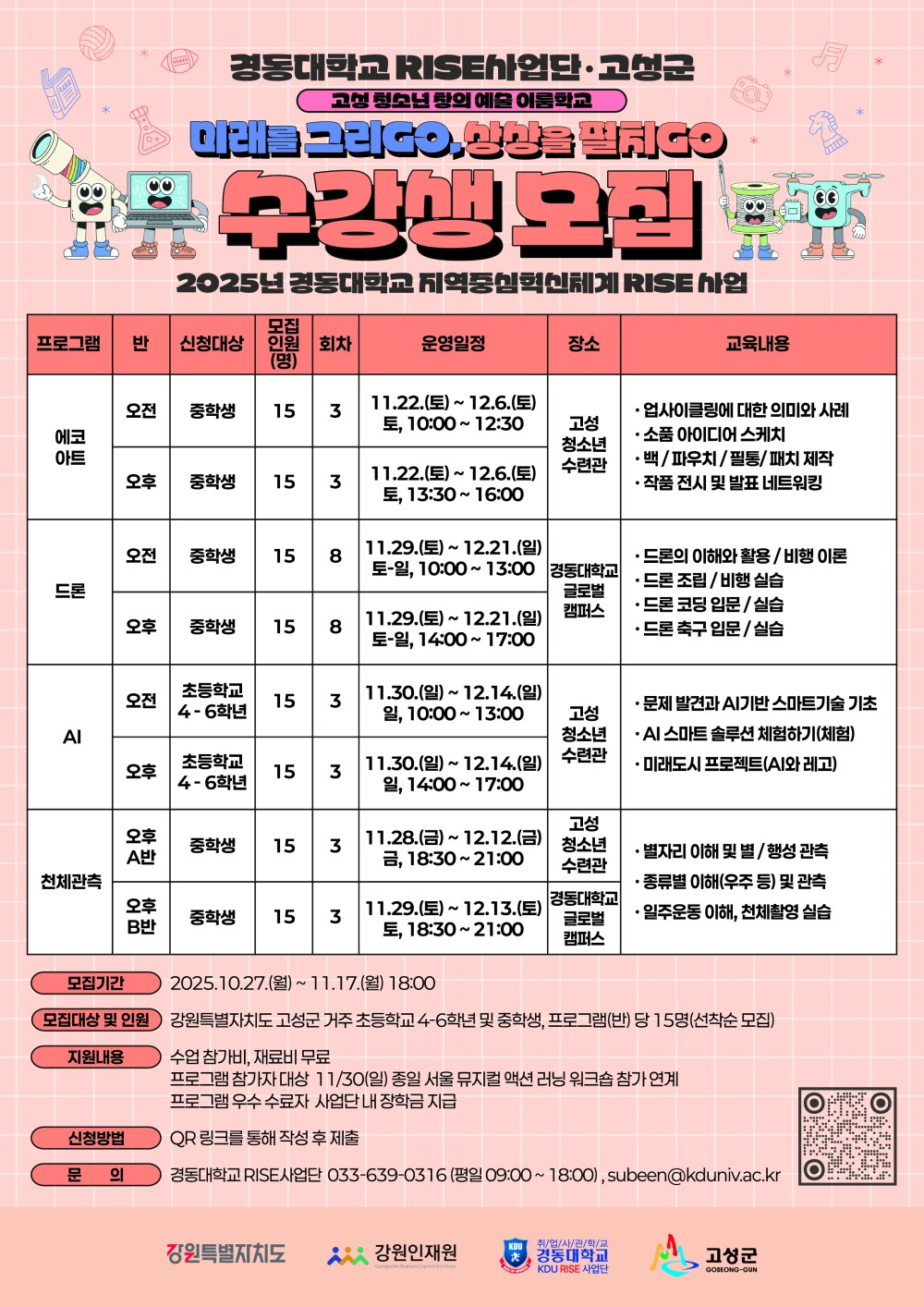[고성군] [경동대학교RISE사업단.고성군]고성 청소년 창의.예술 이룸학교 참가자 모집 …